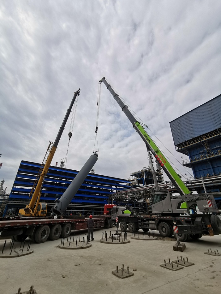 3月31日上午9時(shí),伴隨著指揮人員的一聲哨響,“吸附塔”在兩臺(tái)吊車的默契配合下平穩(wěn)起升,回轉(zhuǎn)、直立、就位一系列動(dòng)作嫻熟準(zhǔn)確,8臺(tái)“吸附塔”在2天內(nèi)相繼完成吊裝,順利完成了該項(xiàng)目建設(shè)的關(guān)鍵節(jié)點(diǎn)。此項(xiàng)目建成后可回收氫氣5500Nm3/h,為加氫裝置用氫提供保障。