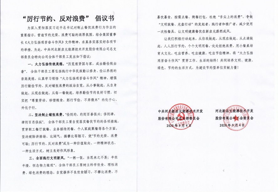 新啟元黨總支、新啟元工會(huì)組織全體職工簽訂了《厲行節(jié)約、反對(duì)浪費(fèi)》倡議書(shū)。倡議全體職工要從自身做起,從點(diǎn)滴做起,積極營(yíng)造“節(jié)約光榮、浪費(fèi)可恥”的氛圍,堅(jiān)決制止餐飲浪費(fèi)行為。